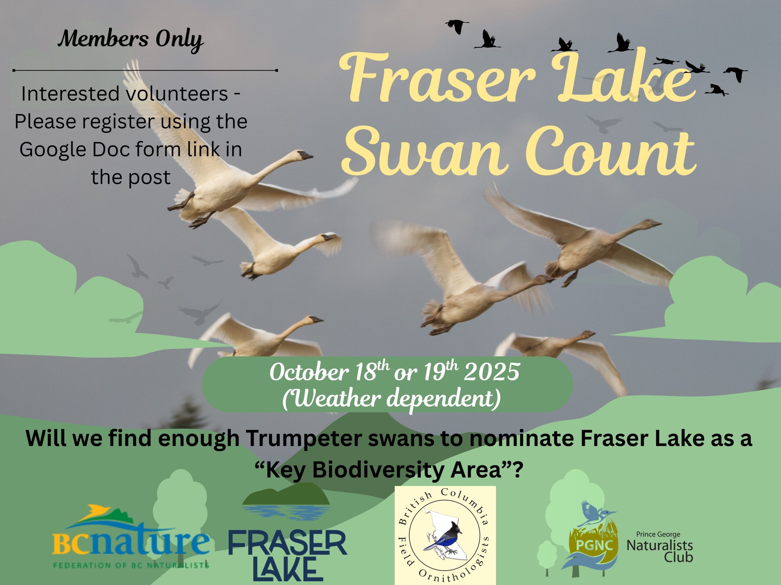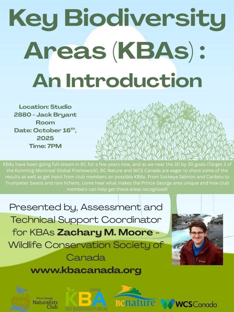 Swan Count at Fraser Lake and area – October 18 or 19, 2025. BC Nature and the Prince George Naturalists Club will be conducting a Trumpeter Swan count at Fraser Lake and area on Saturday, October 18th (or Sunday, October 19th if weather is inclement on the 18th). Seeing sufficient numbers of Trumpeter Swans could lead to identifying a new “Key Biodiversity Area (KBA)”, a valuable designation with species conservation implications. We’re welcoming volunteers to assist. The more volunteers we have, the more sites can be observed simultaneously to avoid double-counting swans in the region.
