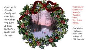 Our winter trails are laden with visions of the season. Come with friends, family and your dogs to walk in the park and enjoy memories made just for you. This is an invitation to visit Moore’s Meadow Park on Dec 20th for Solstice, Christmas and all other seasonal celebrations of light. Bring family and your dogs, as Bosley’s has provided for Christmas Treats for our pets as well. The lights may stay on for a while, so enjoy a winter walk in the snow! There is no specific time – this is a come and go as you wish event and will be left up for people to enjoy for at least a few days.